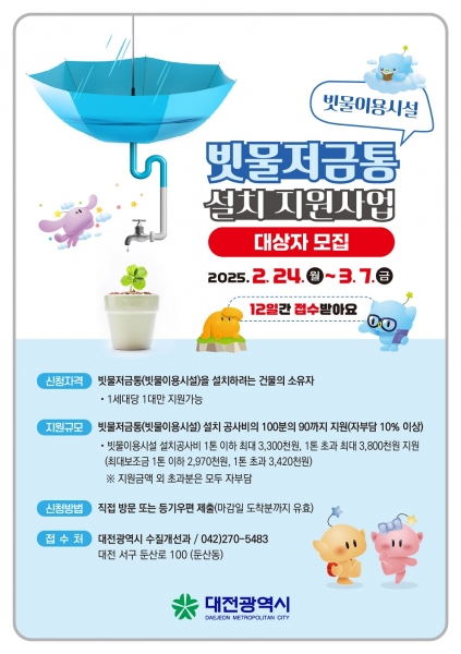 [금요저널] 대전시는 기후변화로 인한 가뭄과 물 부족 문제에 선제적으로 대응하고 물 재이용 문화를 확산하기 위해‘2025년 빗물 저금통 설치 지원사업’을 추진한다.