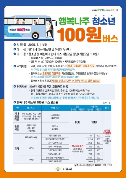 ‘행복 나주 청소년 100원 버스’ 정책에 대한 세부 사항은 나주시청 누리집 또는 읍·면·동 행정복지센터, 각급 학교에서 확인할 수 있다.