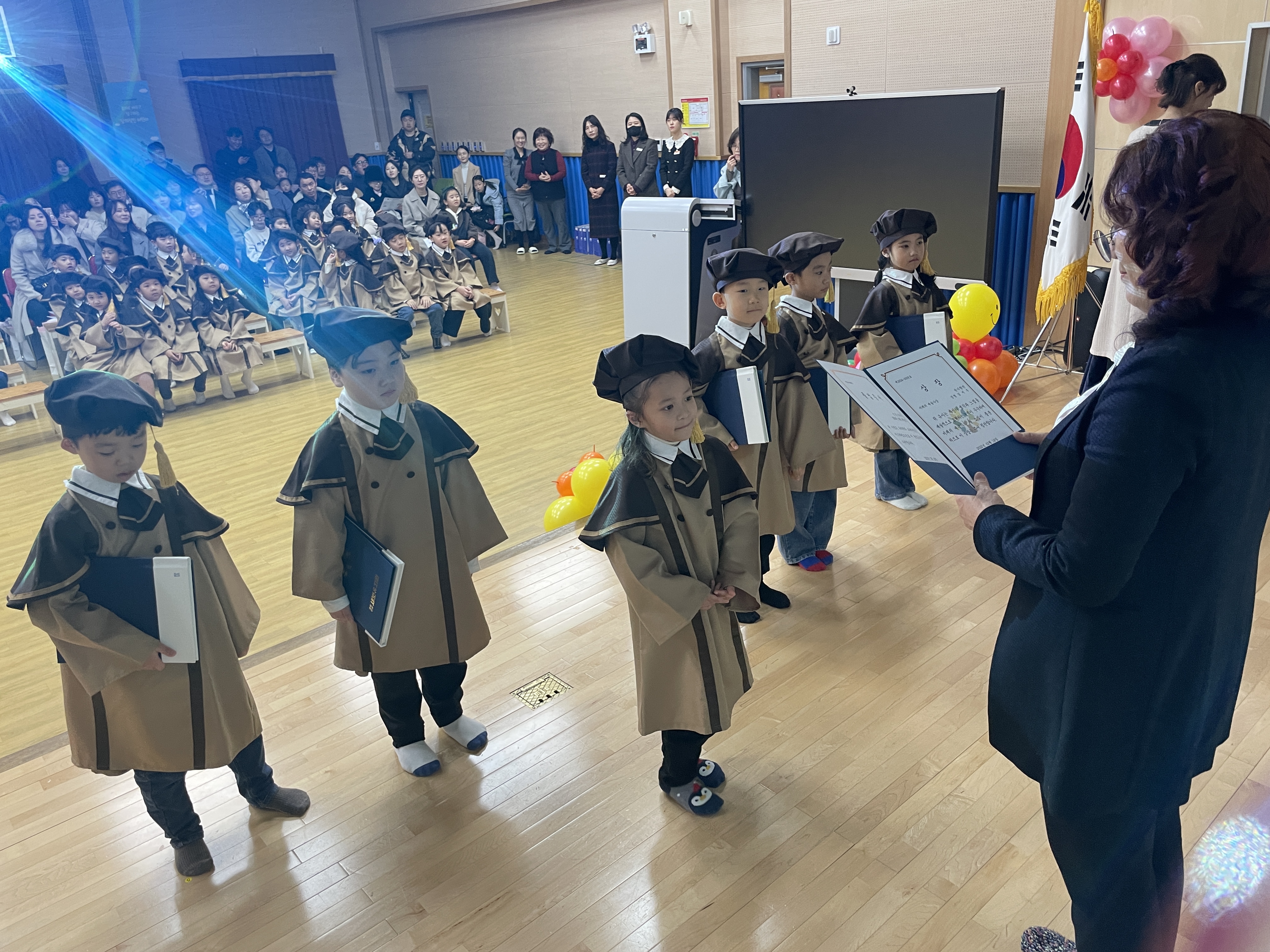 □ 이어서 담임교사의 따뜻한 인사말을 시작으로 졸업생들의 장래희망이 담긴 사진이 공개되었으며, 재원생들은 졸업생들에게 축하의 마음을 담아 송사를 전했다. 졸업식의 후반부에서는 졸업가 제창과 원가 제창이 진행되었고, 마지막으로 한가람반, 빛가람반 유아들의 우쿨렐레 공연으로 감동적인 분위기를 더했다.