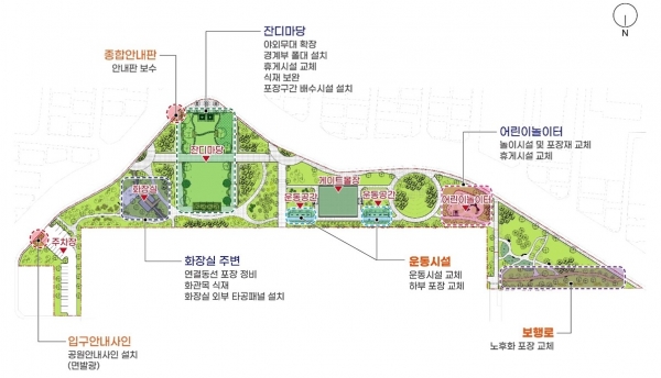 주요 정비 내용은 잔디마당, 운동 공간, 어린이놀이터, 도보길 포장 등이다.