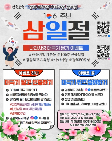 [금요저널] 경북교육청은 24일부터 다음 달 2일까지 경북교육청 공식 SNS에서 광복 80주년 기념 캠페인의 일환으로 ‘삼일절 태극기 달기 이벤트’를 실시한다고 20일 밝혔다.