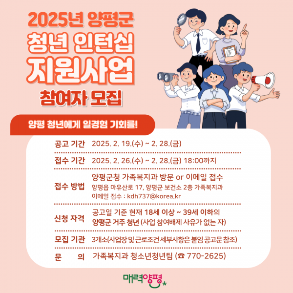 이번 사업은 양평군 내 인력이 필요한 사업장과 관내 거주 미취업 청년을 연계하고 사업장에 인건비를 지원하는 사업으로 접수 기간은 2월 26일부터 28일까지이다.