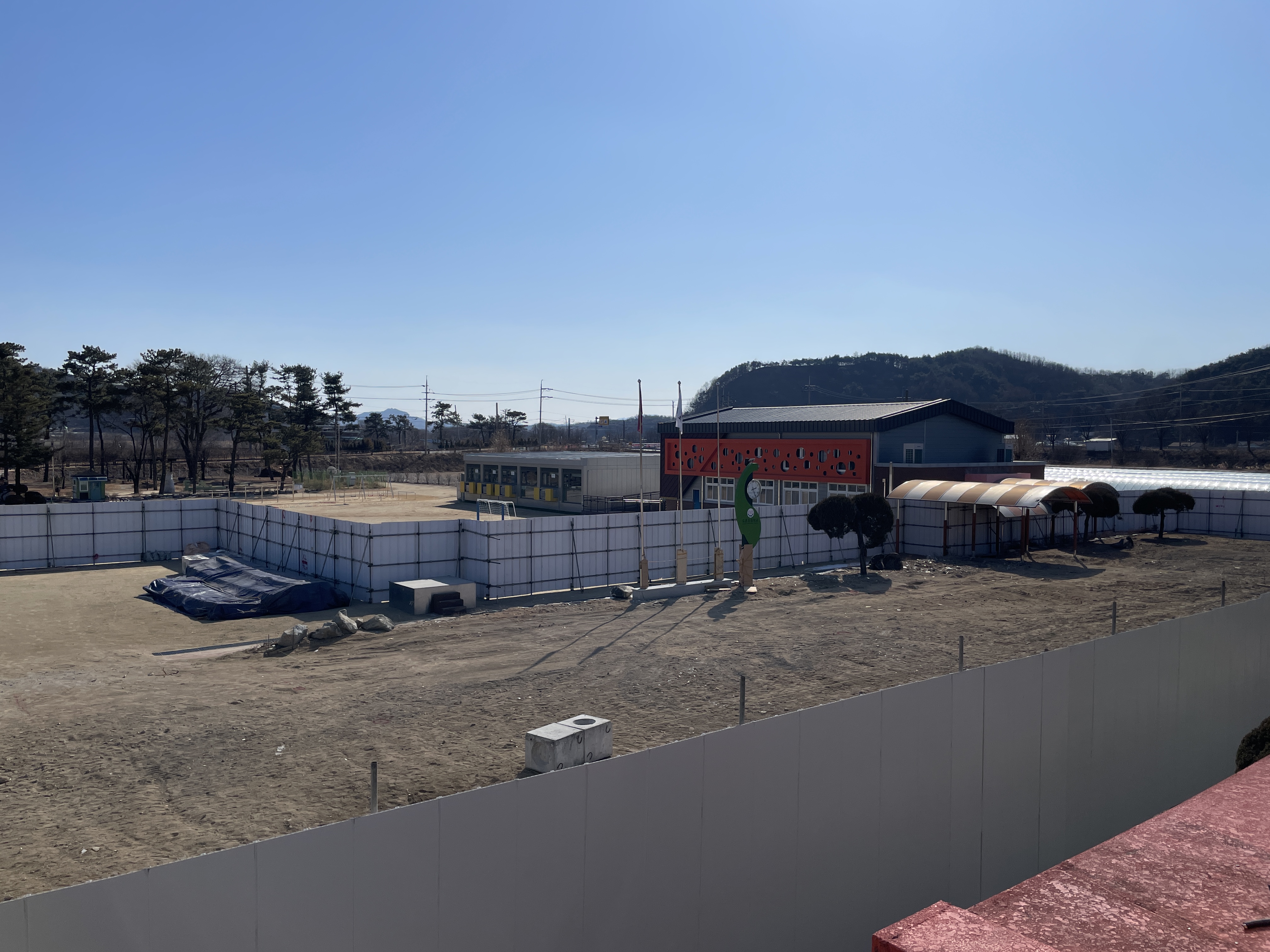 □ 또한 공사현장 가림막으로 인해 축구 골대를 사용하지 못하고 있는 학생들을 위하여 가림막 및 축구 골대의 위치를 조정하여 학생들이 놀 권리를 확보하고자 하였다.