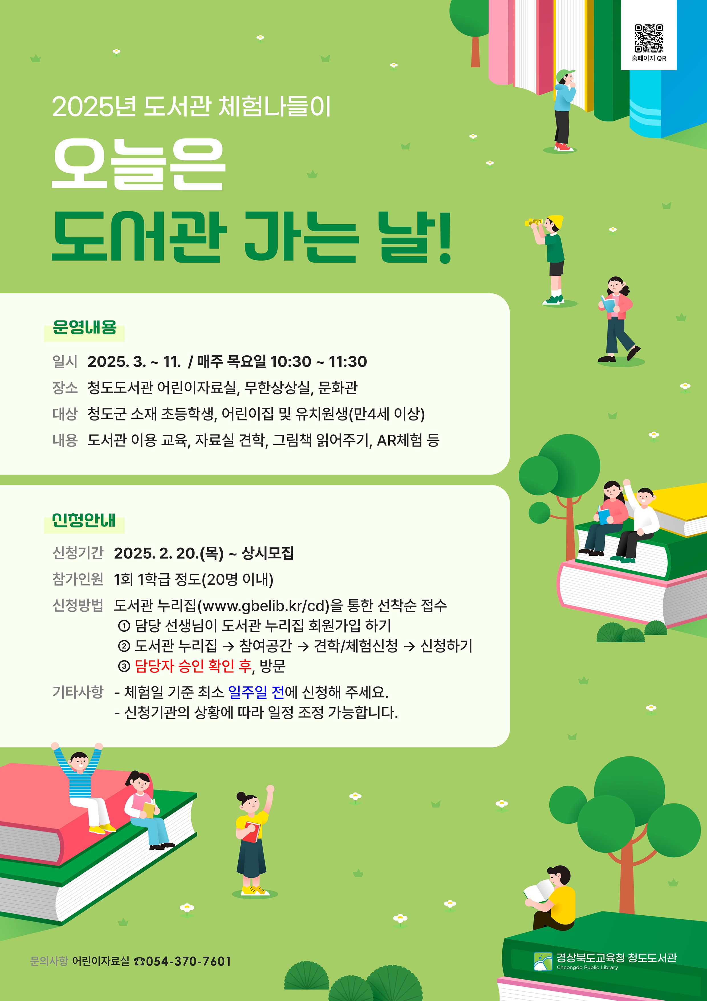 경상북도교육청 청도도서관(관장 조은희)은 지역 내 초등학교, 유치원, 어린이집을 대상으로 도서관 견학 프로그램인 도서관 체험나들이 「오늘은 도서관 가는 날」 참여 기관을 2월 20일(목)부터 모집을 시작한다.