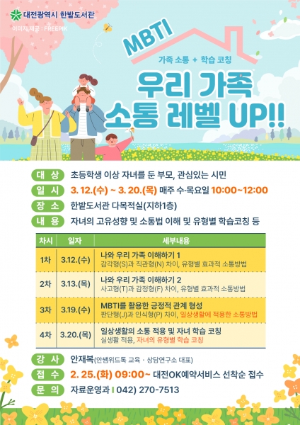 [금요저널] 대전 한밭도서관이 부모와 자녀 간이 소통을 강화하고 맞춤형 학습 코칭을 지원하는 ‘MBTI 우리 가족 소통 레벨UP’ 프로그램을 운영한다.
