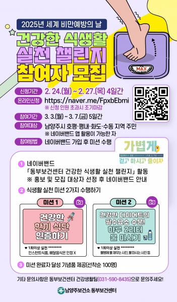 [금요저널] 남양주보건소 동부보건센터는 3월 4일 세계 비만예방의 날을 맞아 시민들의 건강한 식습관을 장려하기 위한 ‘건강한 식생활 실천 챌린지’ 참여자를 24일부터 모집한다.