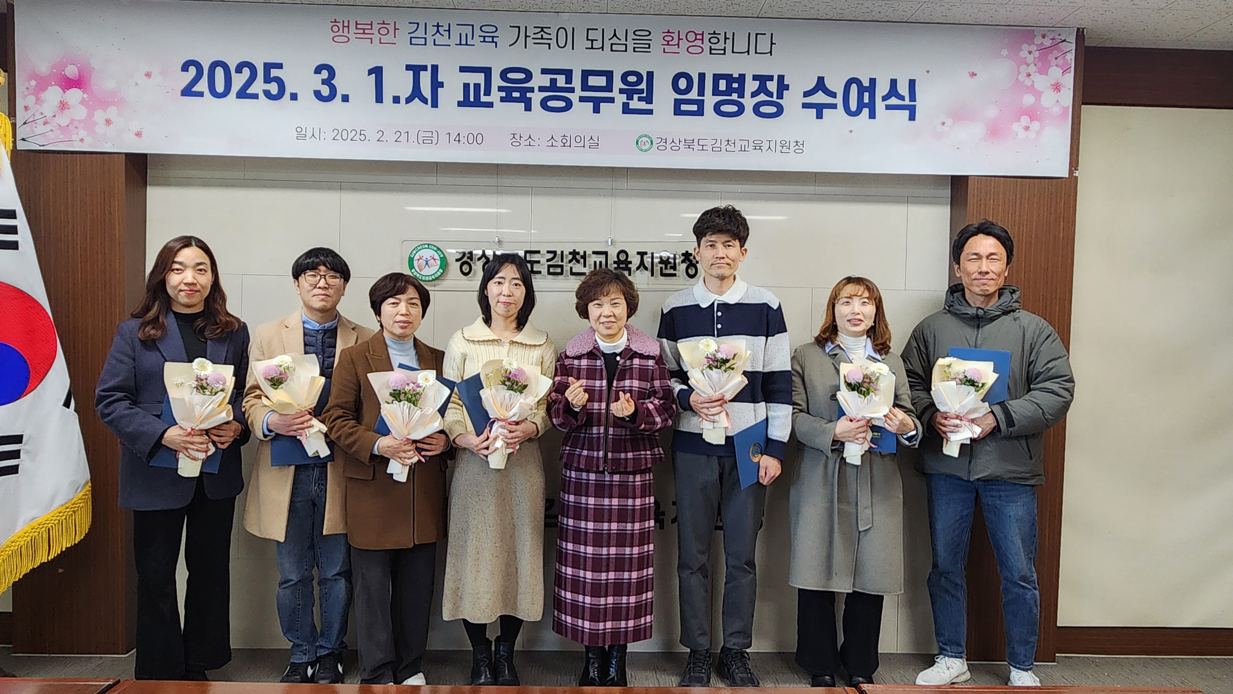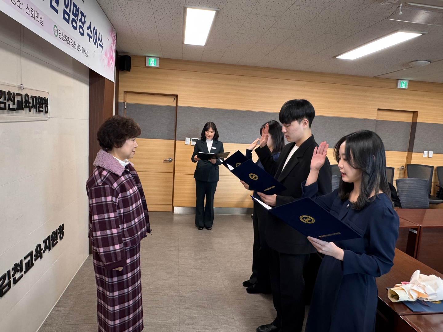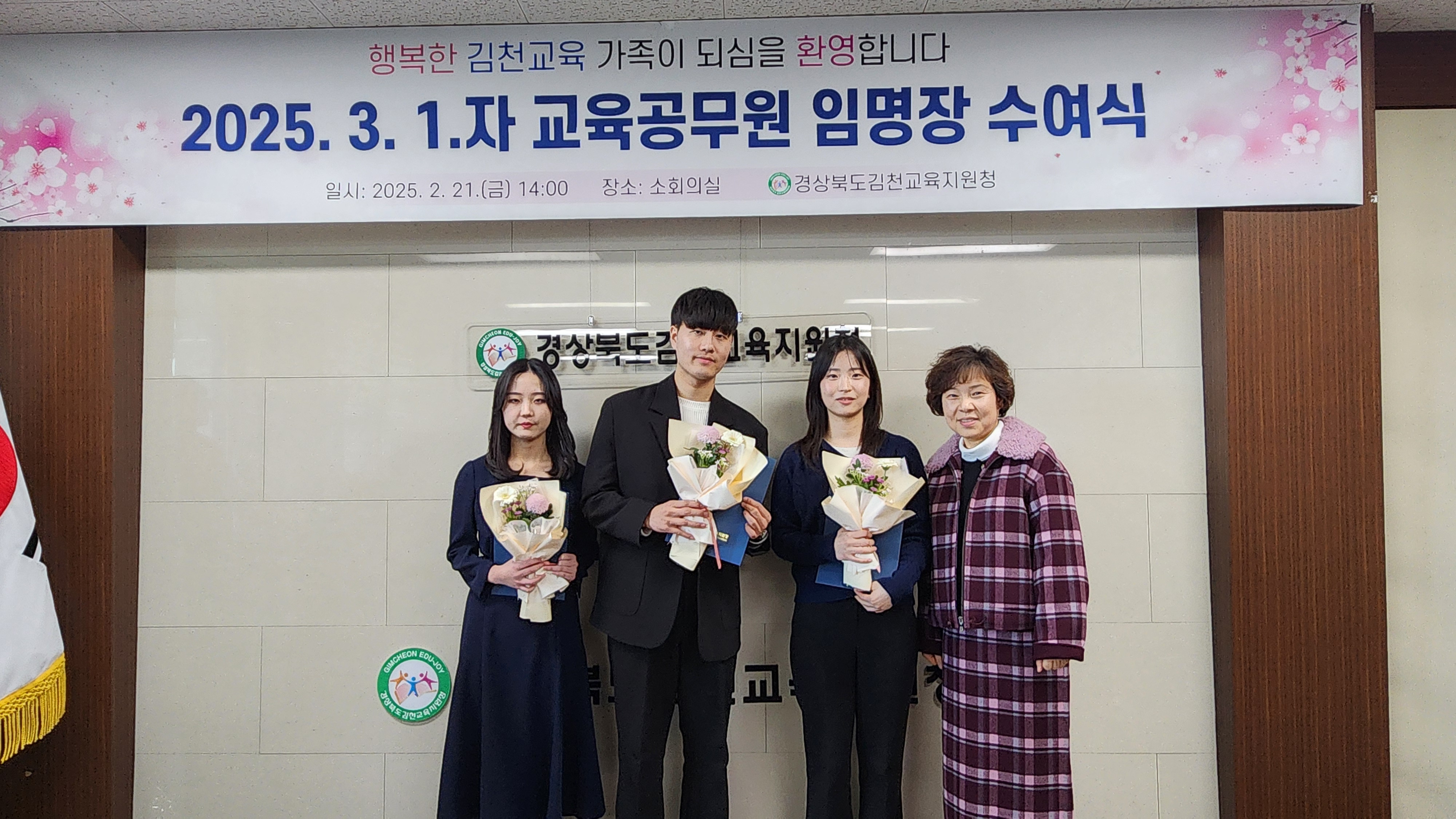 이날 수여식에서는 3명의 초등 신규교사들이 임명장을 받았으며, 김천교육지원청의 직원들이 함께해 새내기 교사들의 힘찬 출발을 축하하고 응원하는 시간을 가졌다. 또한 신규교사들은 국가공무원 선서를 통해 교사로서 헌법과 법령을 준수하고 맡은 바 역할을 성실하게 수행할 것을 다짐하였다.