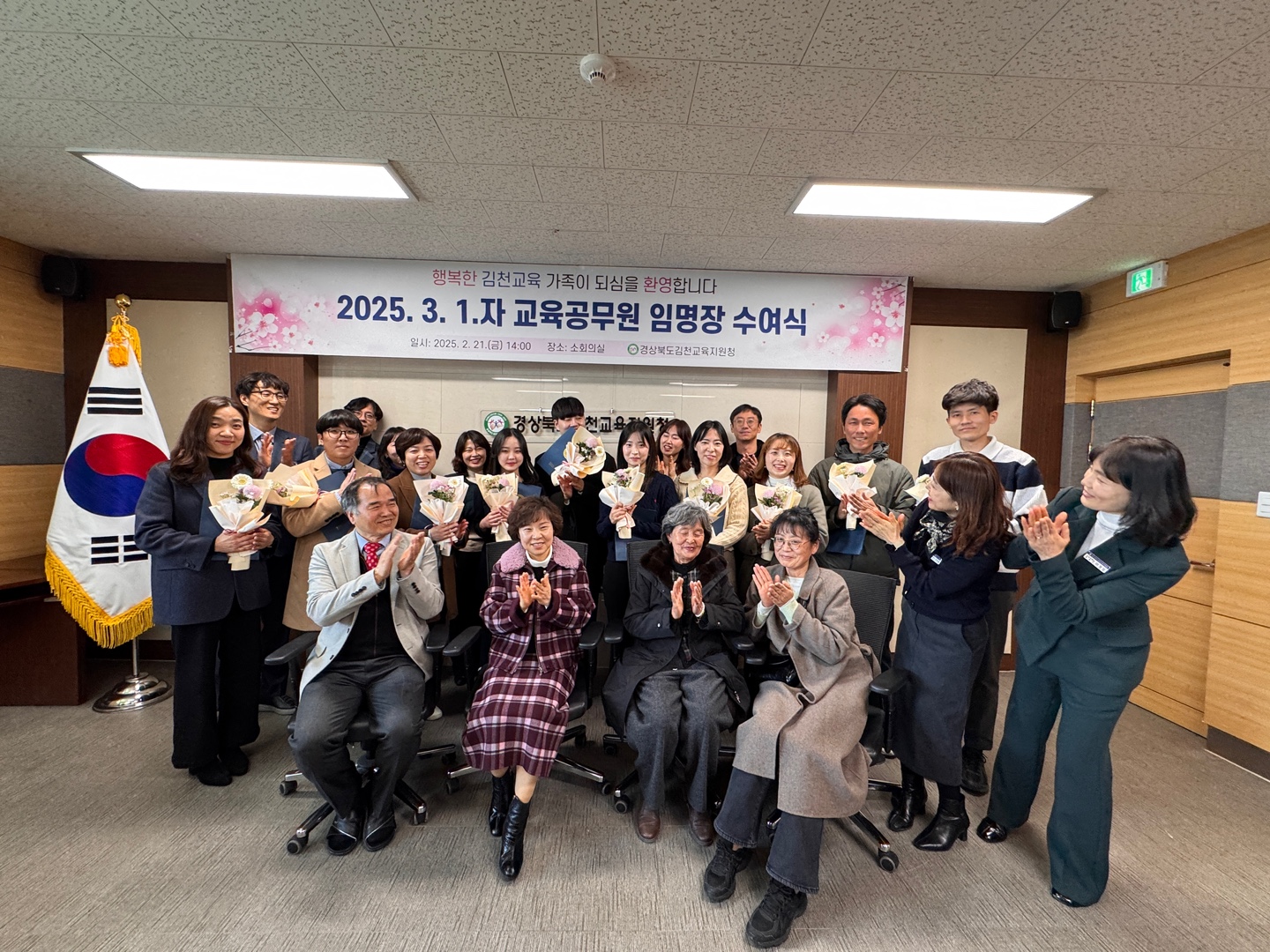□ 김천교육지원청(교육장 모태화)은 2월 21일 14시에 ‘새내기 선생님의 행복한 학교생활을 응원합니다!’란 주제로 2025년 3월 1일자 신규교사에 대한 임명장 수여식을 개최했다. 이 행사는 신규교사들이 교육 현장으로의 첫발을 내딛는 중요한 순간을 기념하기 위해 마련되었다.