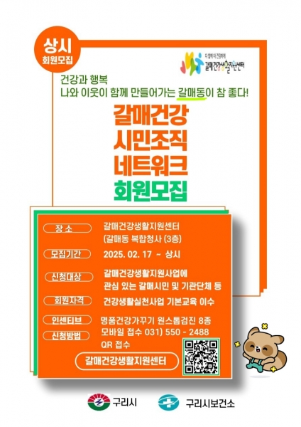 [금요저널] 구리시 갈매건강생활지원센터는 주민 주도형 건강증진사업 강화를 위해갈매동 주민과 기관단체를 대상으로 갈매건강 시민조직 네트워크 체계를 확립해 본격적으로 가동한다고 밝혔다.