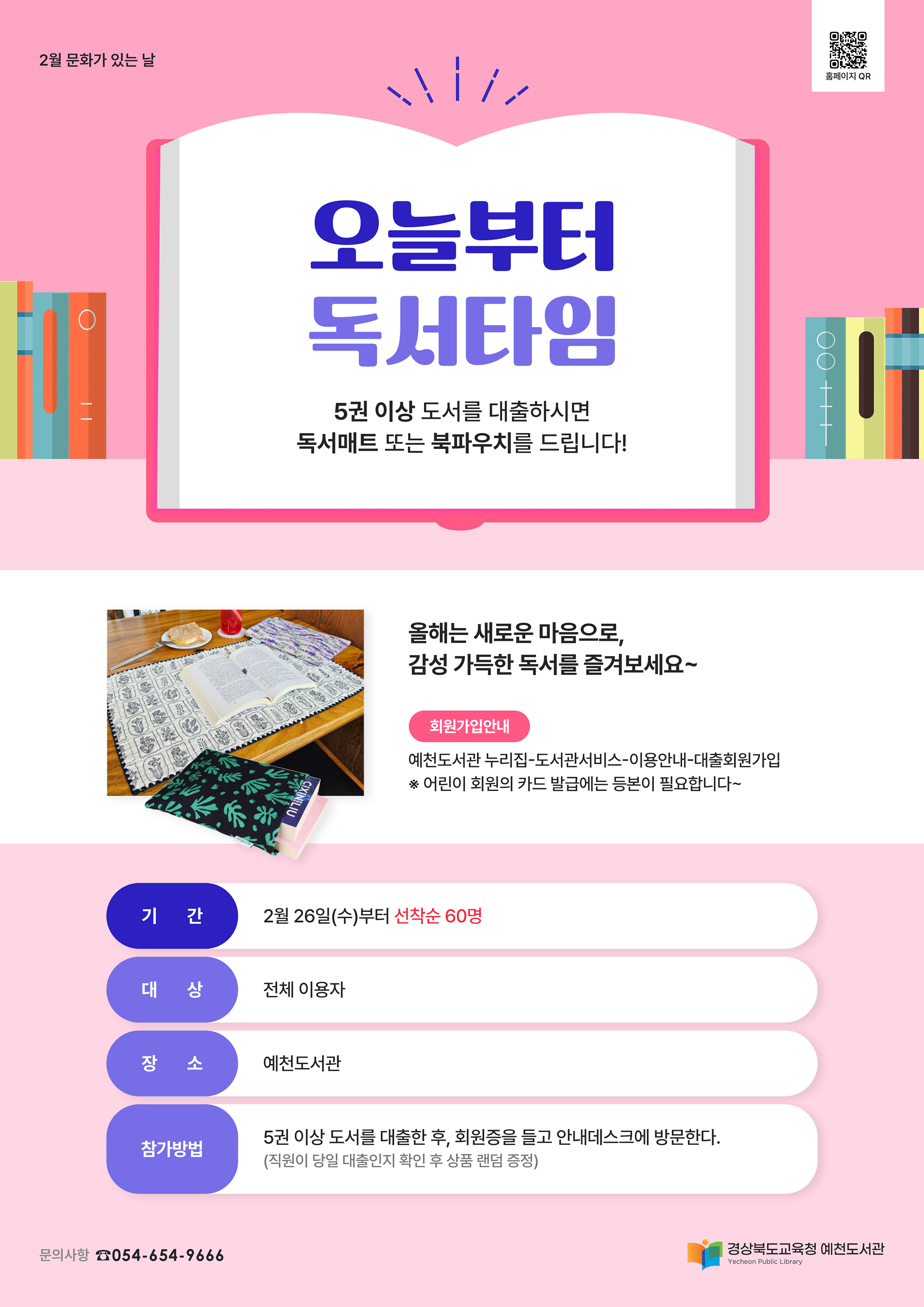 경상북도교육청 예천도서관(관장 권미숙)은 2월 문화가 있는 날 맞아 매달 열리는 도서대출 두 배로 데이와 연체 탈출의 날을 운영하며, 2월 행사로는 ‘오늘부터 독서 타임’을 운영한다.