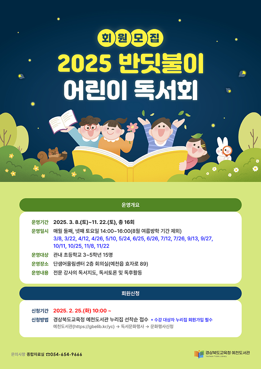 경상북도교육청 예천도서관(관장 권미숙)은 이달 2월 25일부터 예천군 관내 초등학교 3~5학년을 대상으로 2025년 반딧불이 독서회원을 모집한다.