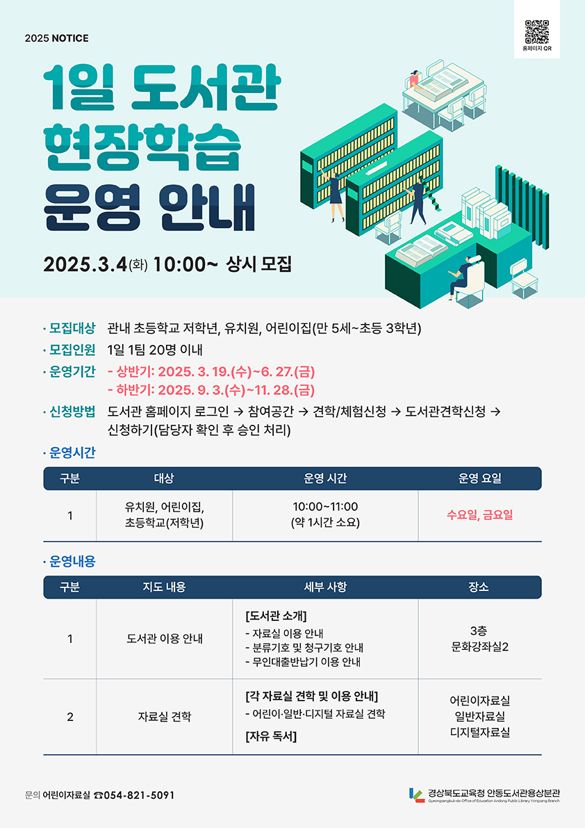 □ 경상북도교육청 안동도서관(관장 박용조)용상분관은 어린이들에게 도서관에 대한 이해와 흥미를 유발하고 단체 활동을 통한 건전한 인격과 정서 함양을 위해 안동 관내 어린이집, 유치원, 초등학교 저학년을 대상으로 내달 19일부터 2025년 「1일 도서관 현장학습」을 운영한다.