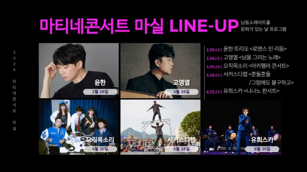 남동문화재단의 문화가 있는 날 상설프로그램인 ‘2025 마티네콘서트 마실’은 남동소래아트홀에서 매달 마지막 주 수요일 오전 11시에 5천 원에 만날 수 있다.