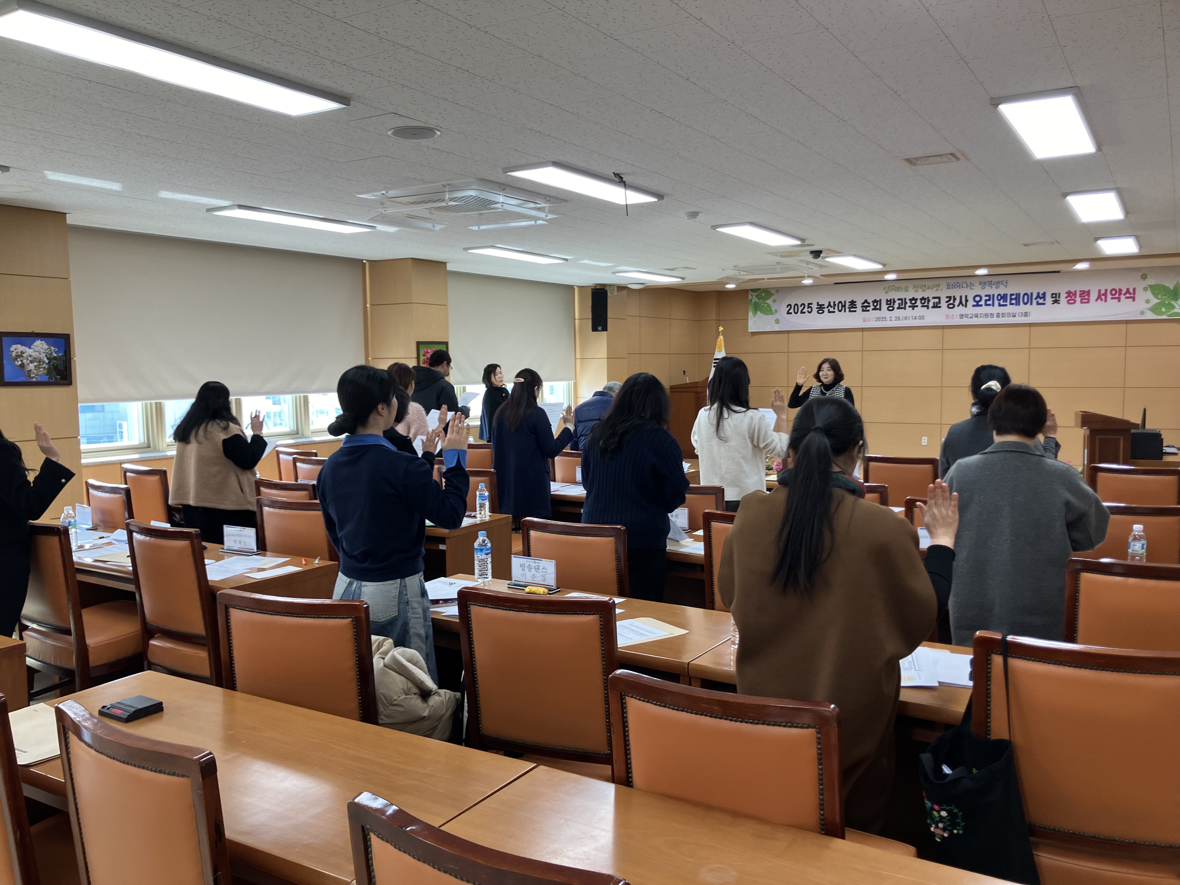 □ 경상북도영덕교육지원청(교육장 윤인한)은 2월 26일(수), 영덕교육지원청 중회의실에서 관내 2025년 초·중 농산어촌 지역 순회 방과후 강사를 대상으로 청렴 서약식 및 오리엔테이션를 실시하였다.