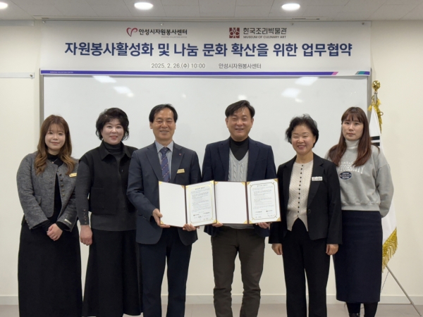 [금요저널] 안성시자원봉사센터는 2월 26일 한국조리박물관과 지역사회 자원봉사 활성화 및 나눔 문화 확산 등 공동 이익 증진을 위한 업무협약을 체결했다.