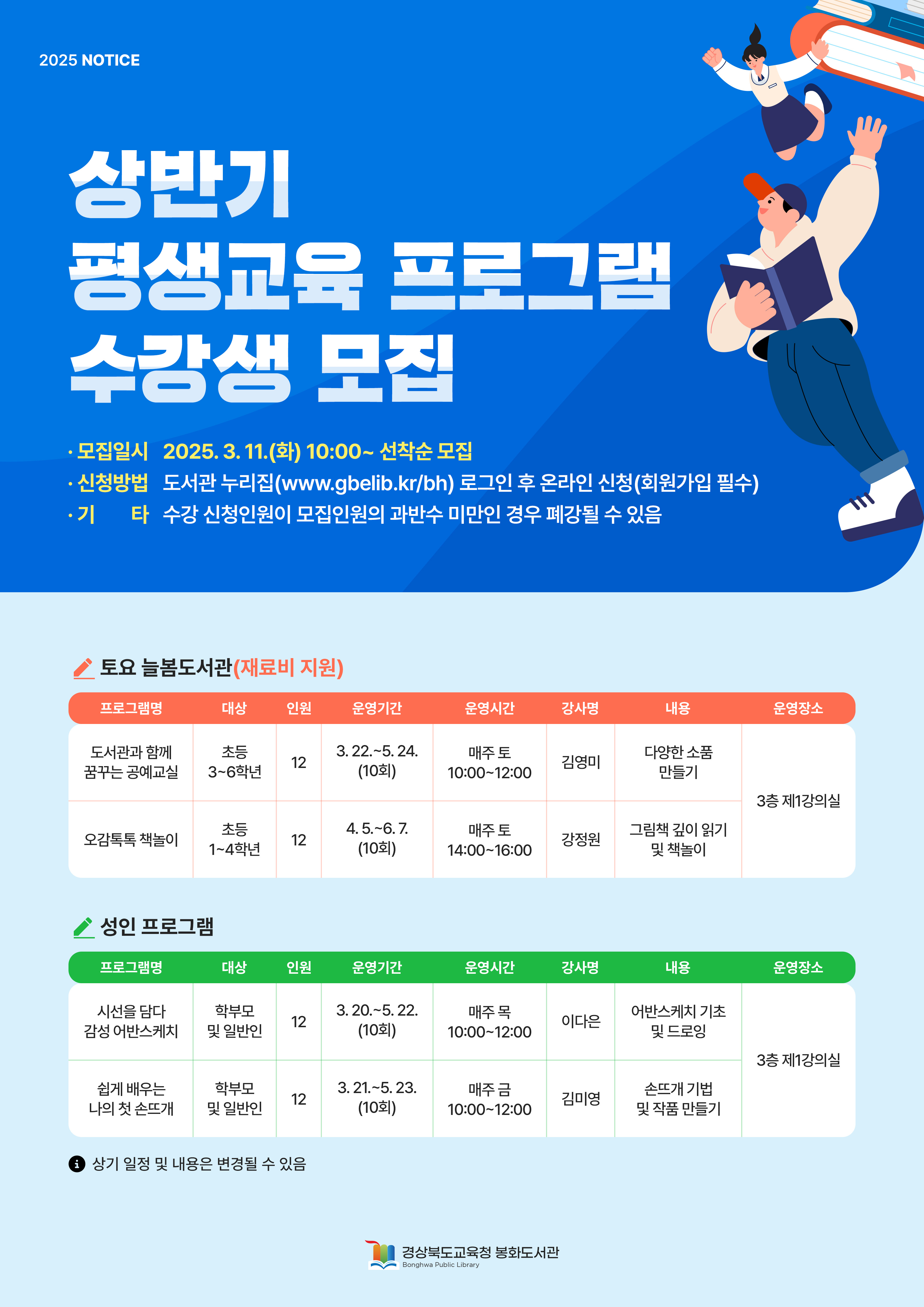 □ 경상북도교육청 봉화도서관(관장 장낙희)은 어린이, 학부모 및 일반인을 대상으로 3월 11일(화)부터 상반기 평생교육 프로그램 수강생을 모집한다.