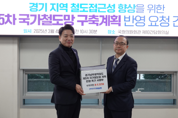 [금요저널] 부승찬 국회의원은 4일 국토교통부 고위 관계자를 만나 수지 주민 4,512명의 서명지를 전달하며 “경기남부 및 용인수지의 교통난 해소와 지역균형발전에 필수적인 경기남부광역철도는 제5차 국가철도망 구축계획에 반드시 반영해야 한다”고 말했다.