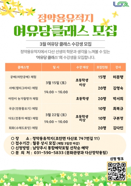 ‘여유당클래스’는 3월 15일부터 매월 1~2회 토요일 오후 2시부터 4시까지 정약용유적지에서 진행된다.