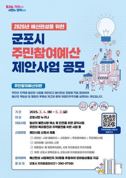 [금요저널] 군포시는 3월 4일부터 5월 2일까지 ‘2026년 예산편성을 위한 주민참여예산 제안사업’을 공모한다.