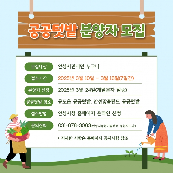 분양 신청은 안성시농업기술센터 홈페이지에서 ‘도시농업 공공텃밭 분양신청’ 배너를 클릭하거나, 안성시청 홈페이지에서 ‘통합예약-기타사업-공공텃밭 분양’ 카테고리를 통해 진행할 수 있다.