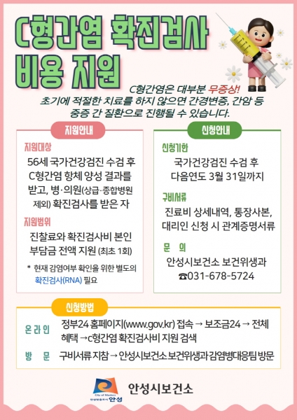 [금요저널] 안성시는 56세 국가건강검진에서 C형간염 항체 양성 판정을 받은 시민을 대상으로 확진검사비 지원 신청을 받는다.