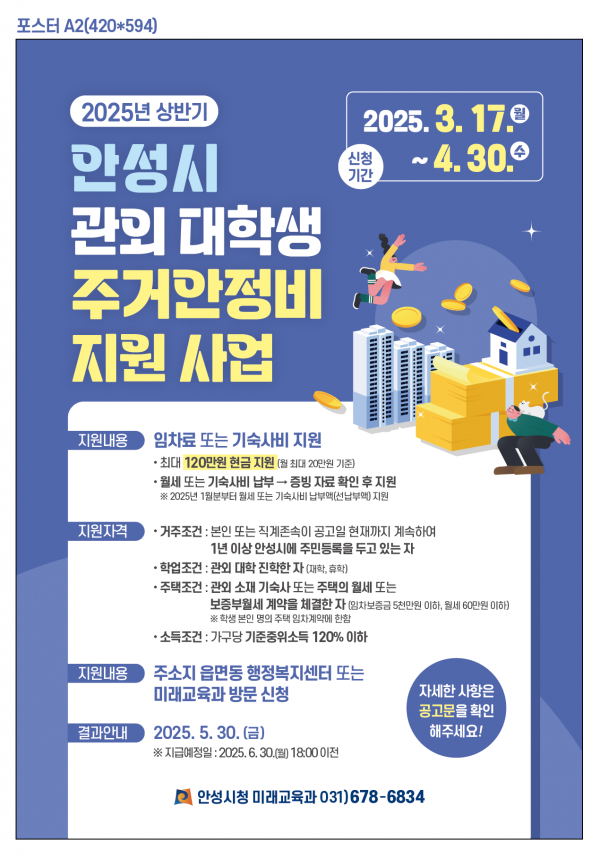 [금요저널] 안성시는 ‘2025년 상반기 안성시 관외 대학생 주거안정비 지원사업’을 시행한다고 밝혔다.