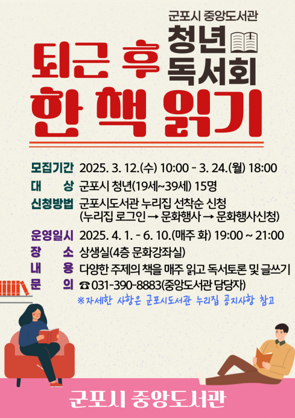 [금요저널] 군포시 중앙도서관은 19세~39세의 지역 청년들을 대상으로 인문교양을 높이고 독서문화를 활성화시키고자 오는 4월부터 청년독서회 ‘퇴근 후 한 책 읽기’를 시작한다.
