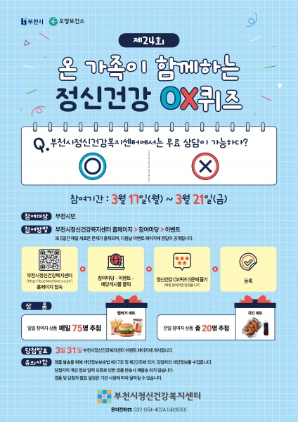 [금요저널] 부천시와 부천시정신건강복지센터는 오는 17일부터 21일까지 ‘제24회 온 가족이 함께하는 정신건강 OX퀴즈’를 진행한다.