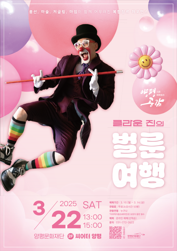 [금요저널] 양평문화재단은 22일 양평문화재단 2층 씨어터 양평에서 시즌 레퍼토리 ‘양평공감’의 첫 번째 작품인 ‘클라운 진의 벌룬여행’을 진행한다고 밝혔다.