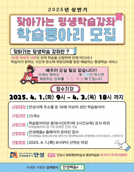 안성시, 맞춤형 평생학습 ‘배달강좌’ 학습동아리팀 모집
