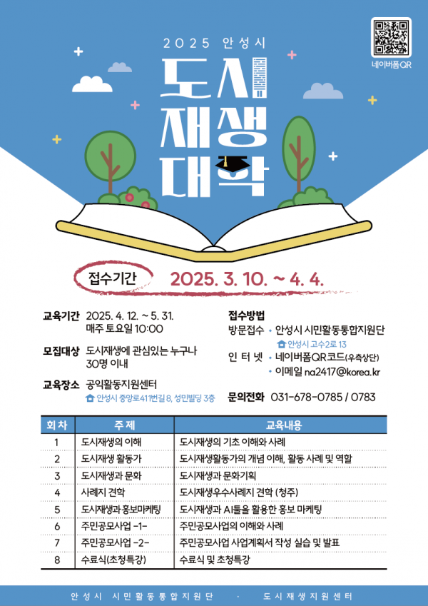 안성시는 급변하는 도시 환경에 맞춰 지역 특성에 적합한 도시재생 전략을 개발하고 이를 실현하기 위한 인재를 양성하기 위해 2025년 도시재생대학을 개설했다.