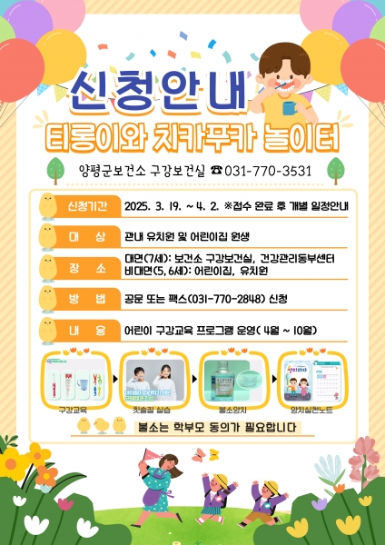 [금요저널] 양평군 보건소는 어린이들의 구강건강 증진을 위해 어린이집과 유치원을 대상으로 ‘티롱이와 치카푸카 놀이터’ 프로그램을 4월부터 10월까지 운영한다고 17일 밝혔다.