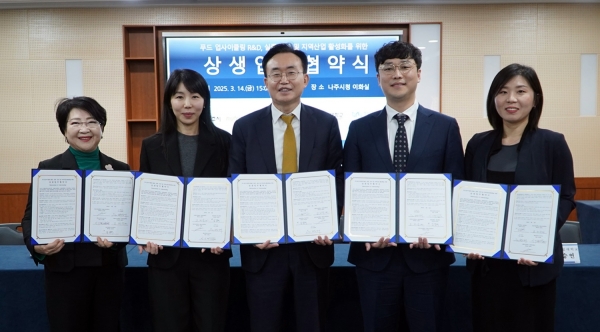 나주시는 지난 14일 시청사 이화실에서 ㈜뉴트리어드바이저, 이화여자대학교, 충북대학교, 경상국립대학교와 ‘푸드업사이클링 실용화를 위한 상생 업무협약’을 체결했다고 17일 밝혔다.