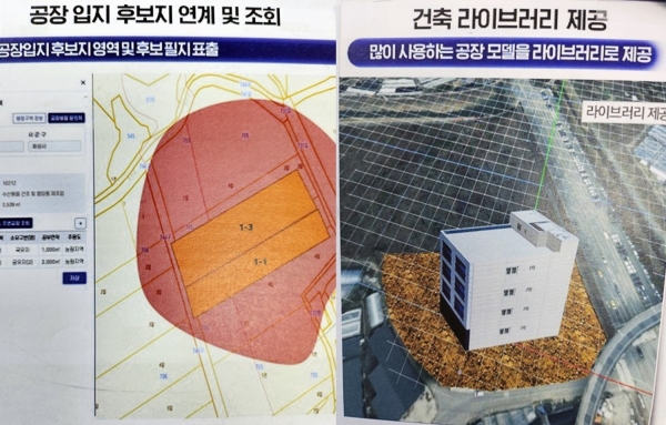지형·건축 시뮬레이션에선 산지전용허가 여부 확인을 위한 평균 경사도 계산, 절·성토 등 토공량 산정 및 평탄화 등 지형 생성, 가상 건축물 생성 기능을 통해 건축할 수 있는 공장 외형을 미리 확인해 볼 수 있다.
