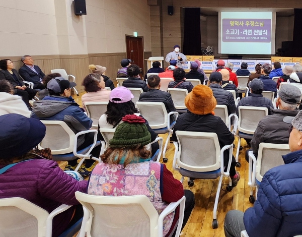 명덕사 우정스님은 “종교보다 일체중생이 먼저다”며 “어르신들이 따뜻한 소고기 한 점으로 건강을 챙기시고 넉넉한 마음으로 새봄을 맞이하시길 바란다”며 후원의 뜻을 밝혔다.