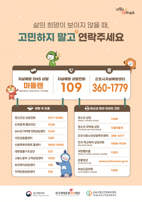 군포시정신건강복지센터군포시자살예방센터는 "자살 고위험 시기에 맞춰 적극적인 홍보로 정신적인 어려움을 겪고 있는 분들은 언제든지 전문 상담 서비스를 이용해 주시길 바라며 도움이 필요한 시민들이 적시에 도움을 받을 수 있도록 노력하겠다"고 말했다.
