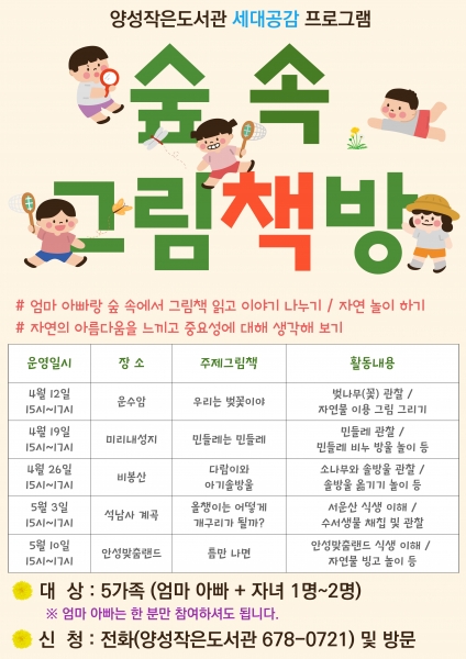 [금요저널] 안성시 양성작은도서관은 관내 아름다운 숲과 좋은 그림책을 통해 가족이 서로의 마음을 전달하고 이해하는 동시에 자연환경의 소중함에 대해 느껴볼 수 있는 ‘숲속 그림책방’을 4월부터 운영한다.