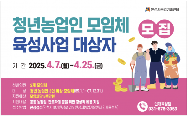 [금요저널] 안성시농업기술센터가 4월 7일부터 25일까지 ‘청년농업인 모임체 육성사업’ 대상자를 모집한다고 밝혔다.