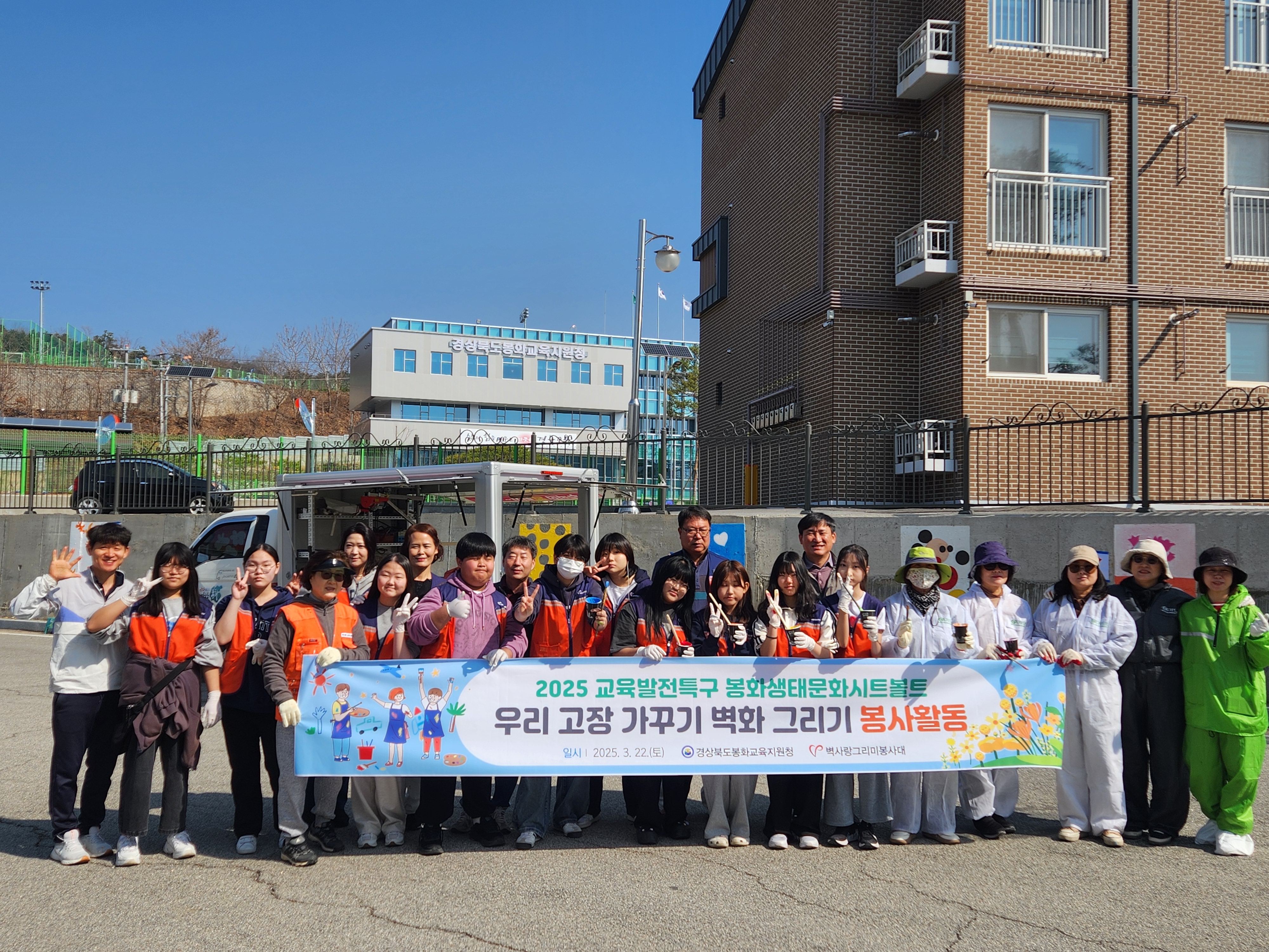 봉화교육지원청(교육장 이영록)은 3월 22일(토)에 교육발전특구 사업의 일환으로 벽사랑그리미봉사대, 봉화중학교 학생들, 봉화군자원봉사센터와 함께 봉화생태문화시드볼트 우리 고장 가꾸기 벽화그리기 봉사활동을 실시하였다.