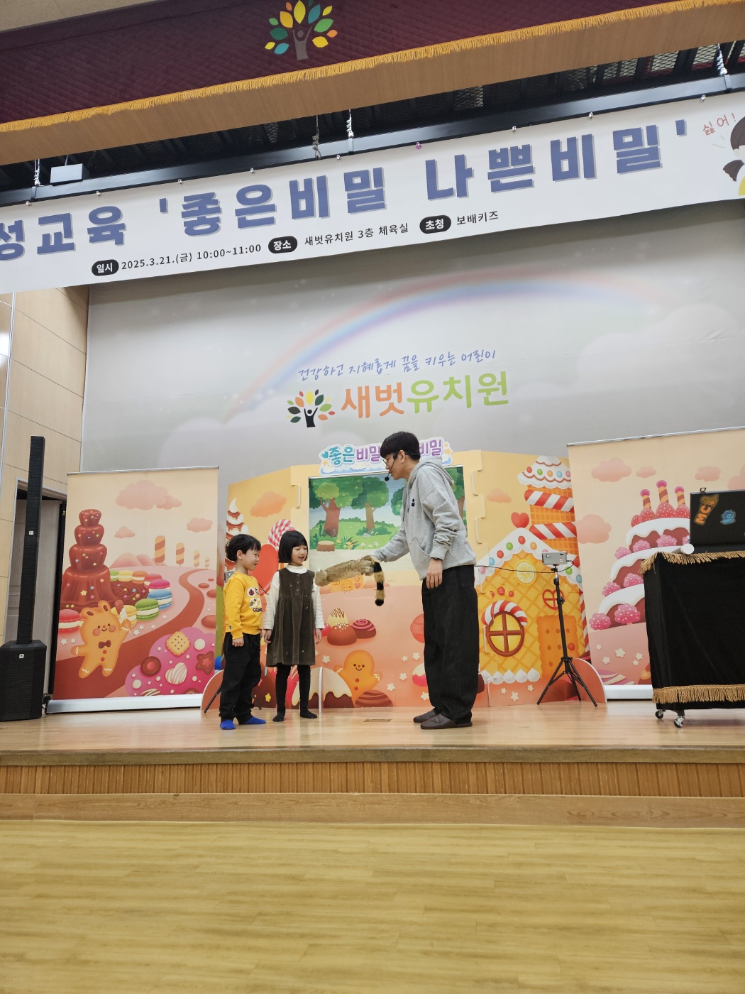 □ 새벗유치원(원장 우수경)은 3월 21일(금) 3층 체육실에서 유아 124명을 대상으로 ‘좋은 비밀 나쁜 비밀’ 인형극을 관람했다.
