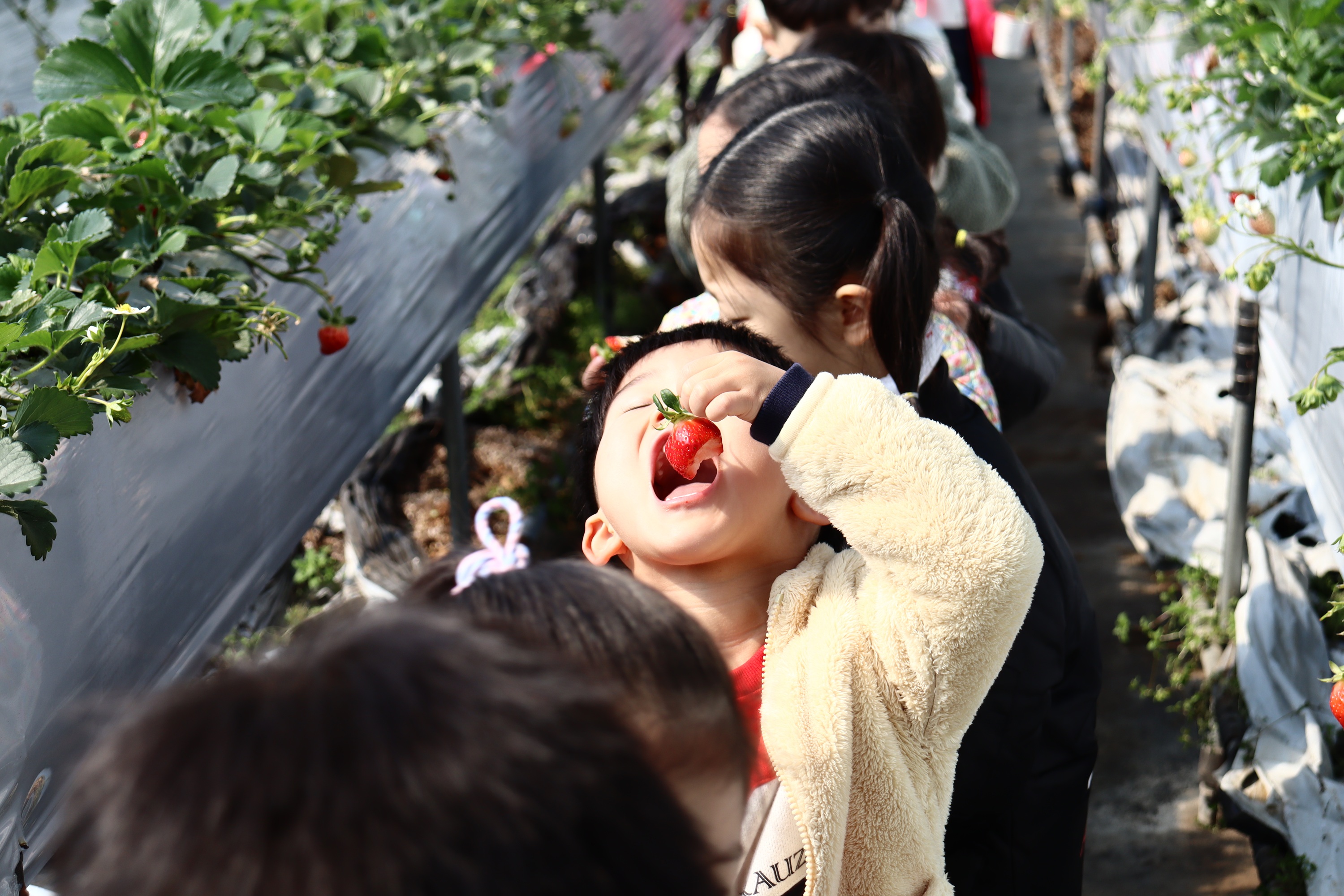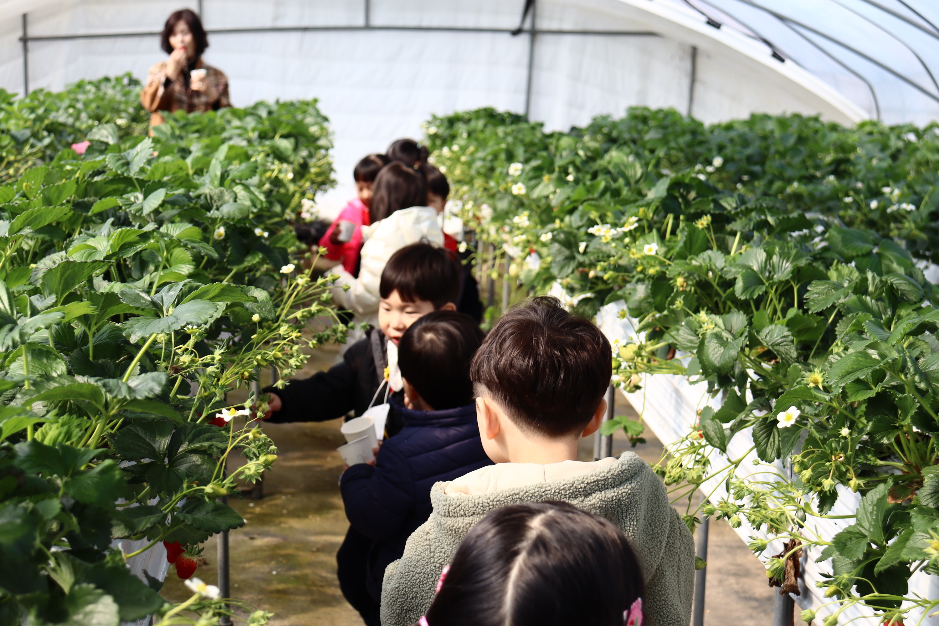 ▣ 유아 안전을 위해 이틀에 걸쳐 진행된 딸기 따기 체험은 딸기 농장 사장님께 맛있게 익은 딸기를 구분하는 방법과 딸기를 따는 방법에 대해 안내를 받은 후 딸기밭에서 진행되었다.