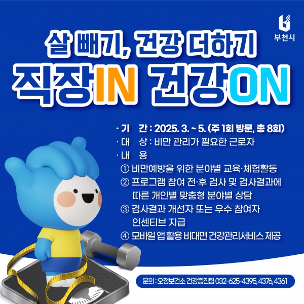 [금요저널] 부천시는 사업장에서 근무하는 근로자의 건강 수준 향상을 위해 오는 24일부터 부천우편집중국과 고강종합사회복지관에서 ‘직장IN 건강ON’ 비만 관리 프로그램을 운영한다.