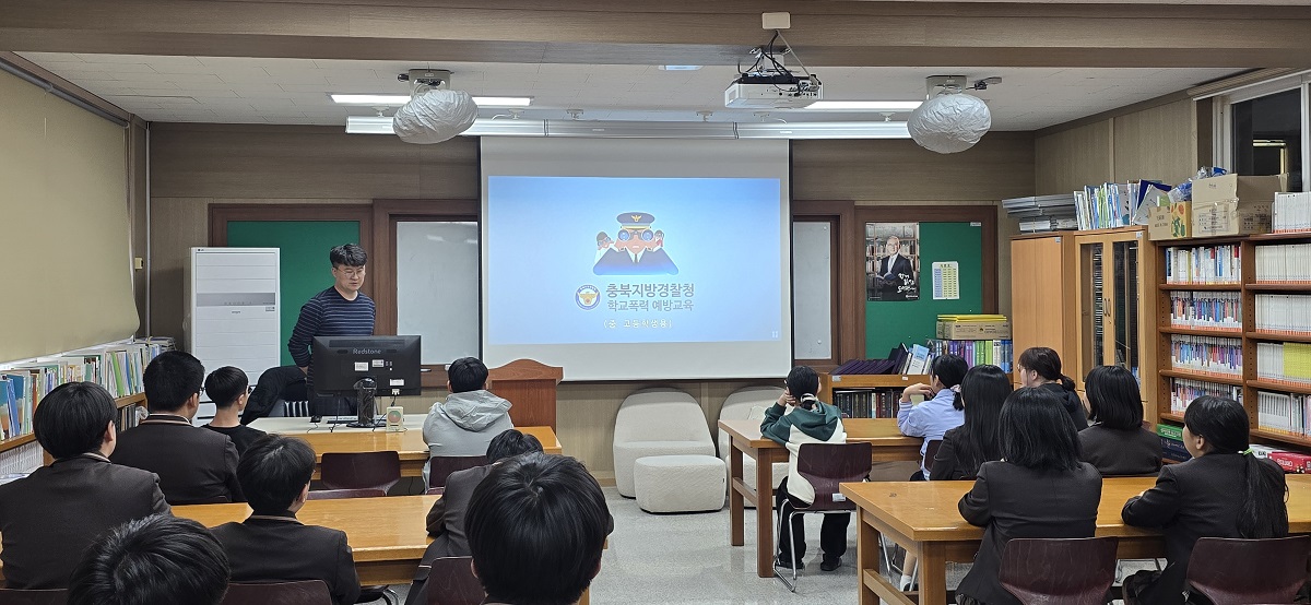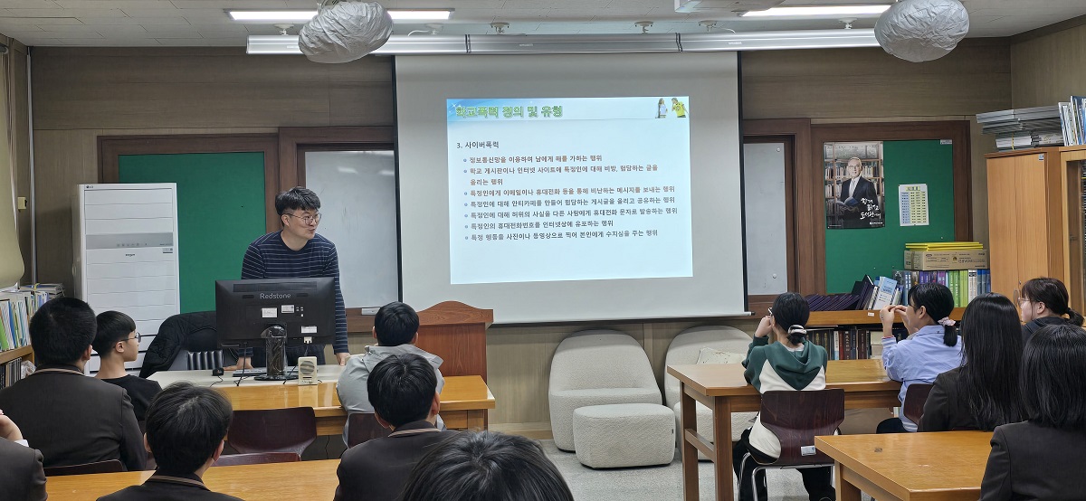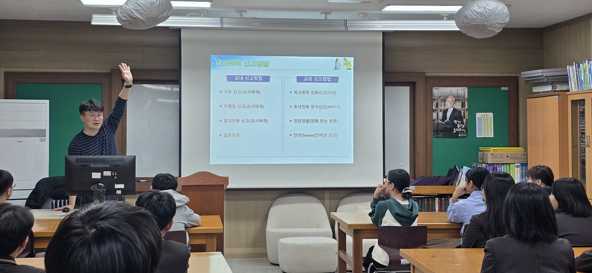 - 교육은 생활안전부장교사가 전교생을 대상으로 본교 강당에서 진행하였다. 교육내용은 학교폭력의 정의와 유형, 학교폭력의 종류, 학교폭력 관련 징후 및 대처, 학교 폭력 신고 방법, 학교 폭력 발생 시 처리 순서, 가해학생 조치(징계) 종류 등을 교육하였다.