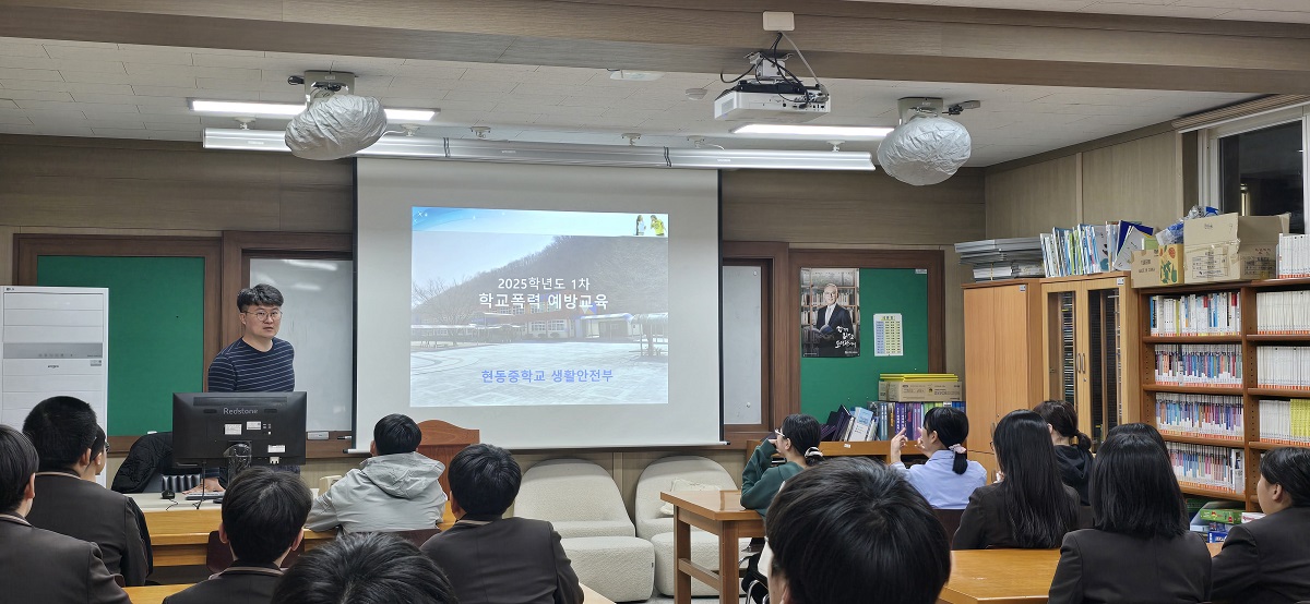 - 현동중학교(교장 김양훈) 학생들은 3월 24일(월) 강당에서 7교시에 1차 학교폭력 예방교육을 받았다. 학교폭력 예방교육은 본교 생활안전부장 이ОО 선생님이 담당하였다.
