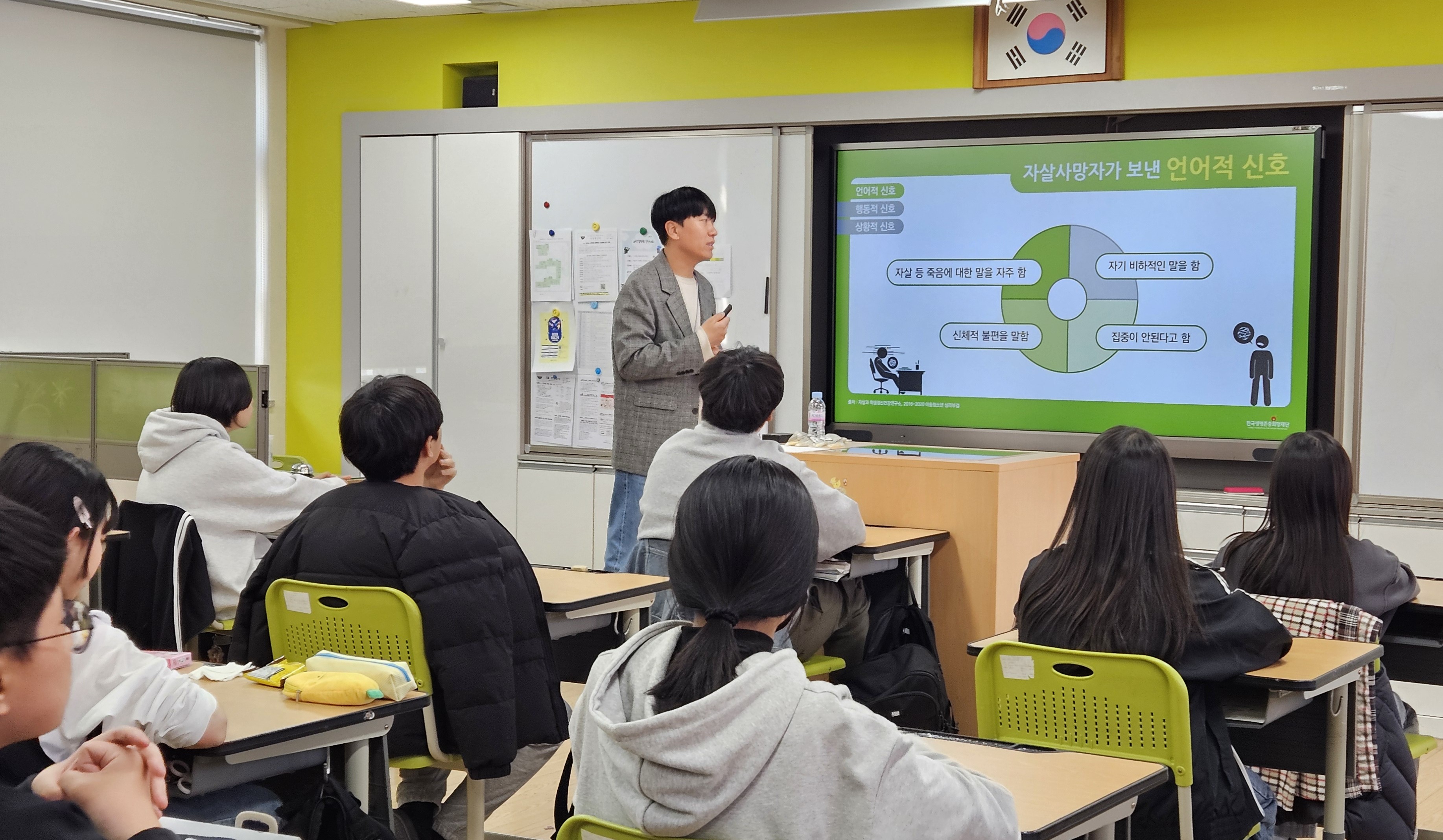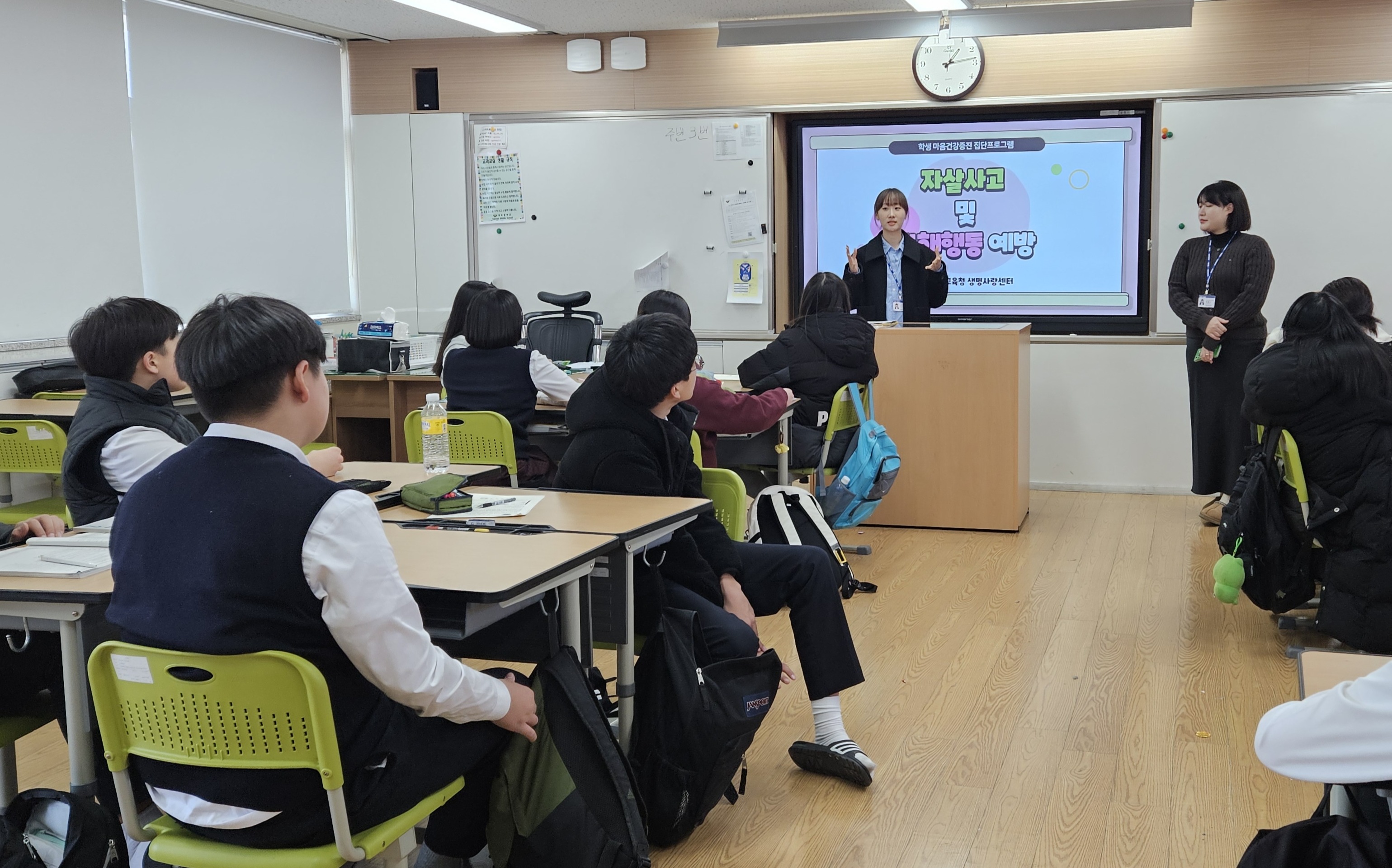 □ 1학년 학생들에게는 칠곡군정신건강복지센터 소속 전문 강사들이 ‘생명지킴이교육’을, 23학년 학생들에게는 경상북도교육청 생명사랑센터 소속 전문 강사들이 ‘학생 마음건강 증진 프로그램:자살사고 및 자해행동 예방교육’을 진행하였다.