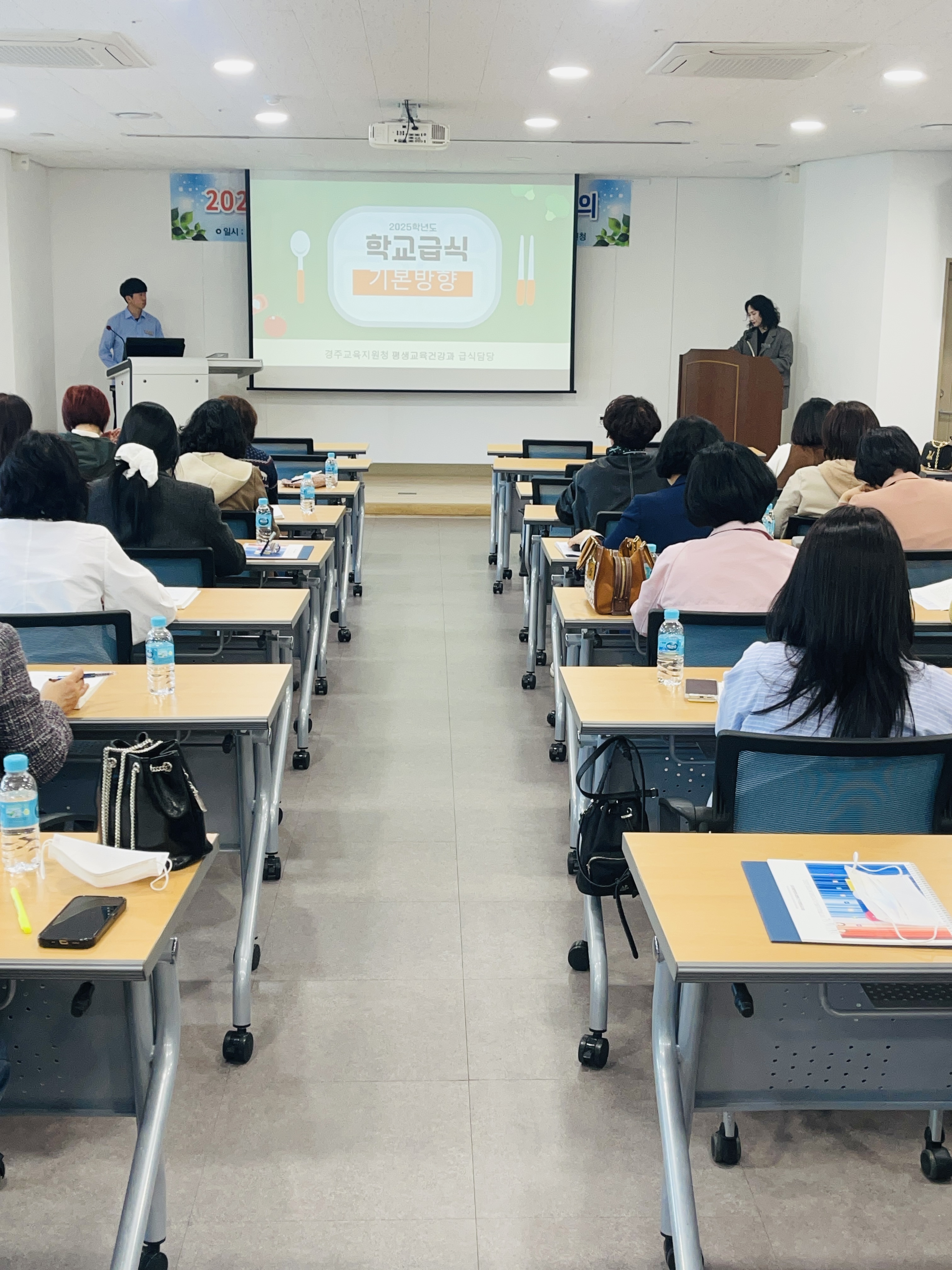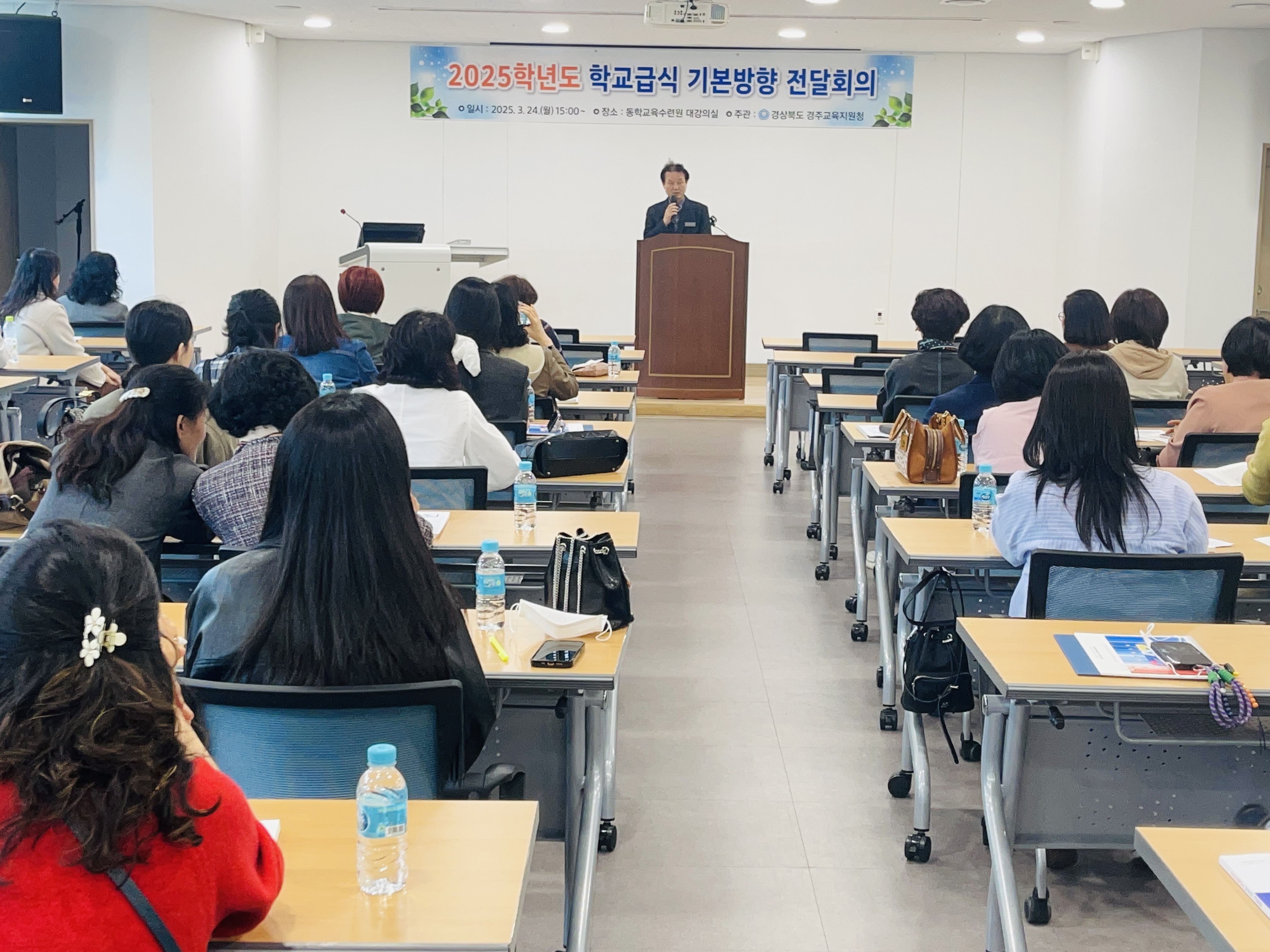 경주교육지원청(교육장 황영애)은 2025년 3월 24일(월) 동학교육수련원 대강의실에서 경주 관내 공립단설유치원 및 공·사립 초·중·고·특수학교의 영양교사 및 영양사를 대상으로 ‘2025학년도 학교급식 기본방향 전달회의’를 개최했다.