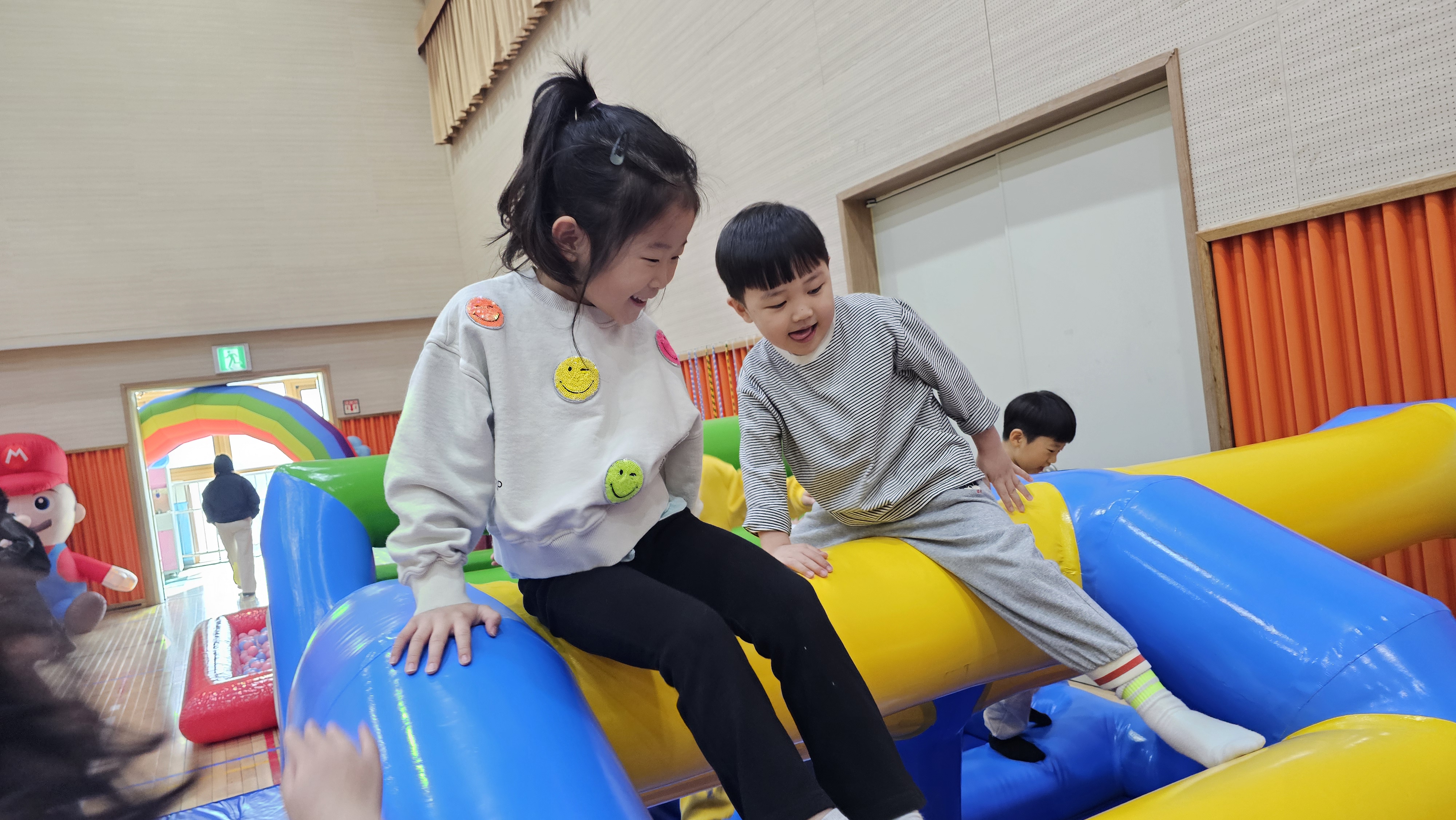 학교 강당에서 함께 에어바운스 놀이를 하며 서로 배려하고 협력하는 모습으로 놀이를 즐겼다.
