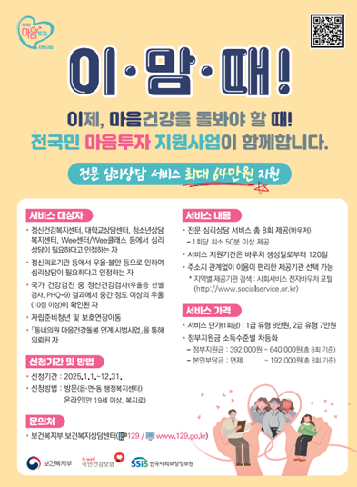 대상자에게는 120일 동안 총 8회 전문적인 1대1 대면 심리상담 서비스를 받을 수 있는 바우처가 제공된다.