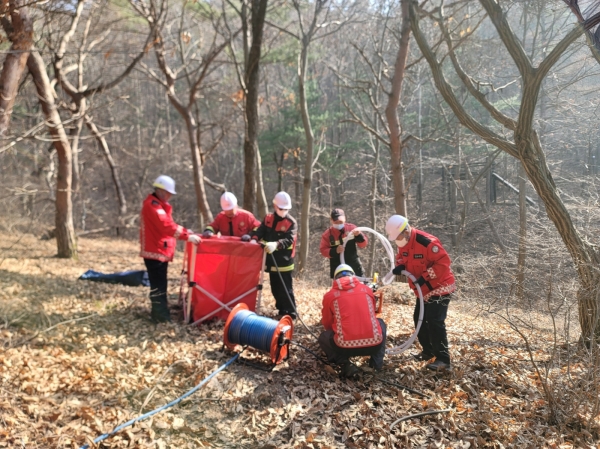 이번 훈련은 등산이나 캠핑 등 산지 여가 활동이 증가하고 건조한 날씨와 강풍이 부는 등 봄철 사회적, 자연적 요인으로 대규모 산불이 발생한 상황을 가정해 실시됐다.