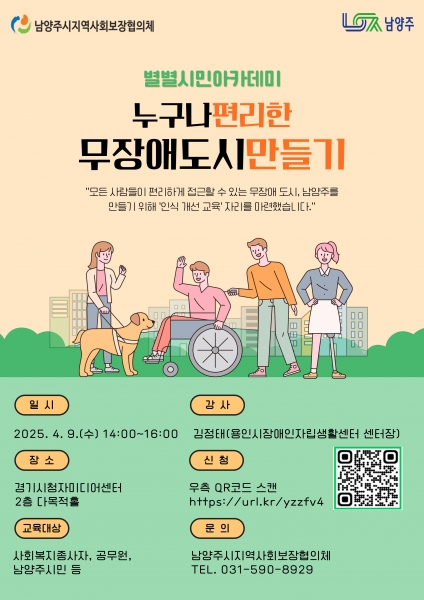 [금요저널] 남양주시지역사회보장협의체 장애인분과는 오는 4월 9일 오후 2시 경기시청자미디어센터 2층 다목적홀에서 '누구나 편리한 무장애 도시 만들기'를 주제로 찾아가는 시민복지학교 별별시민아카데미를 개최한다.
